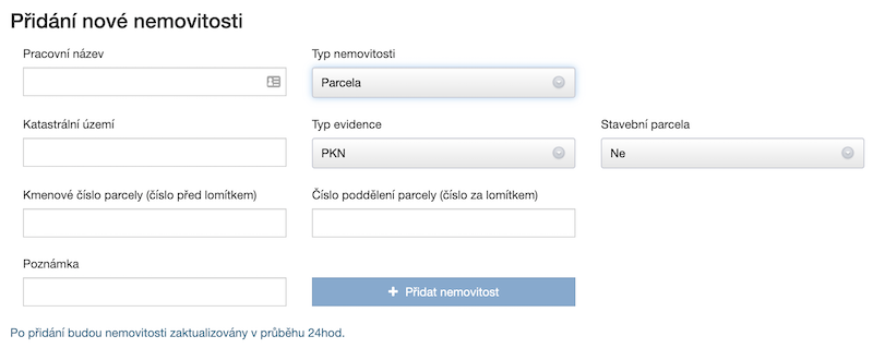 Pokud se rozhodnete některou nemovitost hlídat, je potřeba robotovi ukázat konkrétně kterou. Zadávání probíhá zhruba stejně, jako když hledáte nemovitost na Katastru. Nejdříve určíte, zda se jedná o pozemek, byt či budovu, určíte katastrální území, číslo parcelní nebo číslo bytu atd. Jakmile nemovitost přesně identifikujete a uložíte do systému, od této chvíle se již o vše postará robot. Níže najdete ukázku takového zadávacího formuláře.